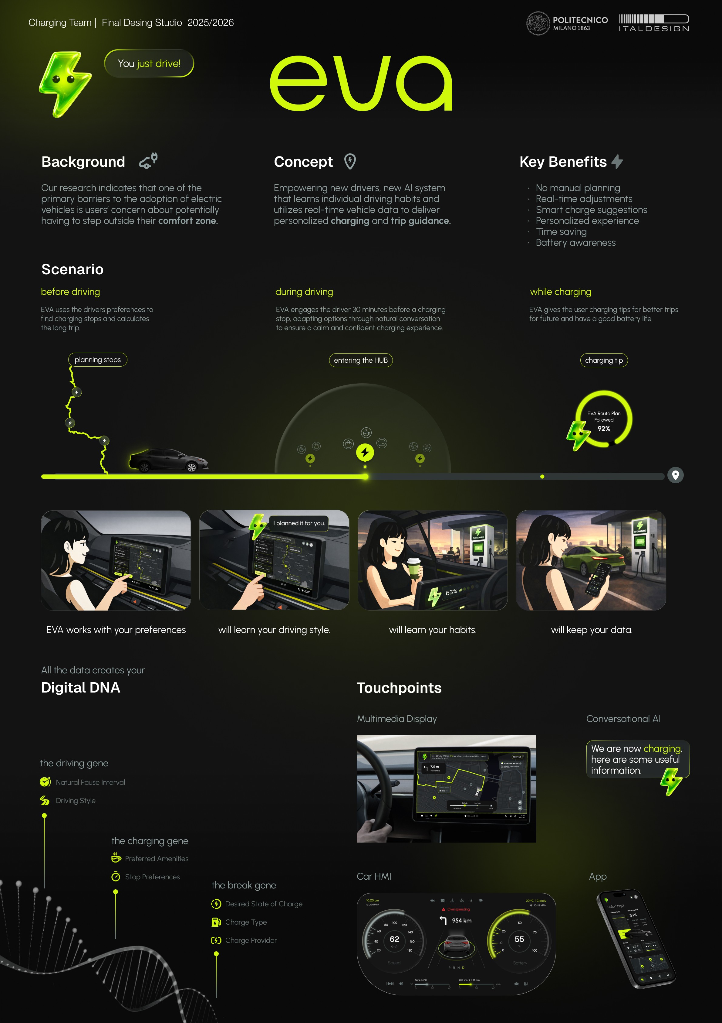 EVA is an AI-powered navigation assistant that transforms EV charging by building a unique "Digital DNA" for every driver. Using machine learning, it learns individual preferences; such as specific amenities or dining habits to proactively suggest tailored stops 20 minutes before arrival via a context-aware Voice User Interface (VUI). This creates a hyper-personalized, distraction-free journey that prioritizes the driver's comfort over just the battery status.