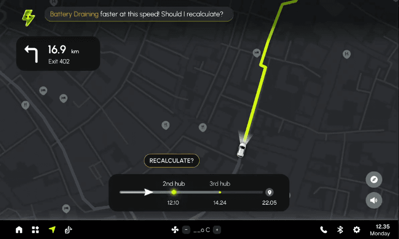 If the driver is over speeding and draining the battery from expected, EVA gives feedback to the driver and rearranges the journey.